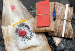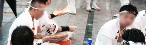 包みは竹皮、四角い木枠で押した白飯、塩ごま、たくあん。梅干しは弁当が傷みにくくなるように、30年ほど前にひと粒のせることにした。稲わらで結んで箸と口上書きを挟む。八坂神社の御神田の米も1升分、入っている、という。沢庵も江戸期以降のものだから、要するにメシだけの弁当である。